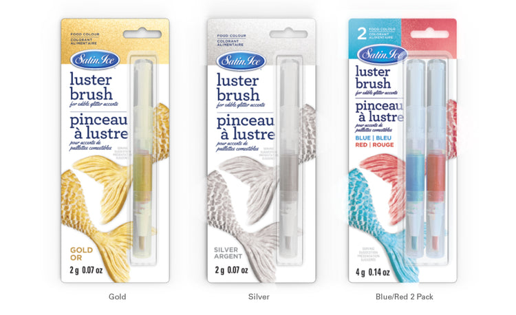 The Satin Ice Luster Brush contains 100% edible luster and a brush all in one, making it easy and fun to paint glittery accents on your creations such as cookies, cakes or cupcake toppers that have a smooth, hardened surface.